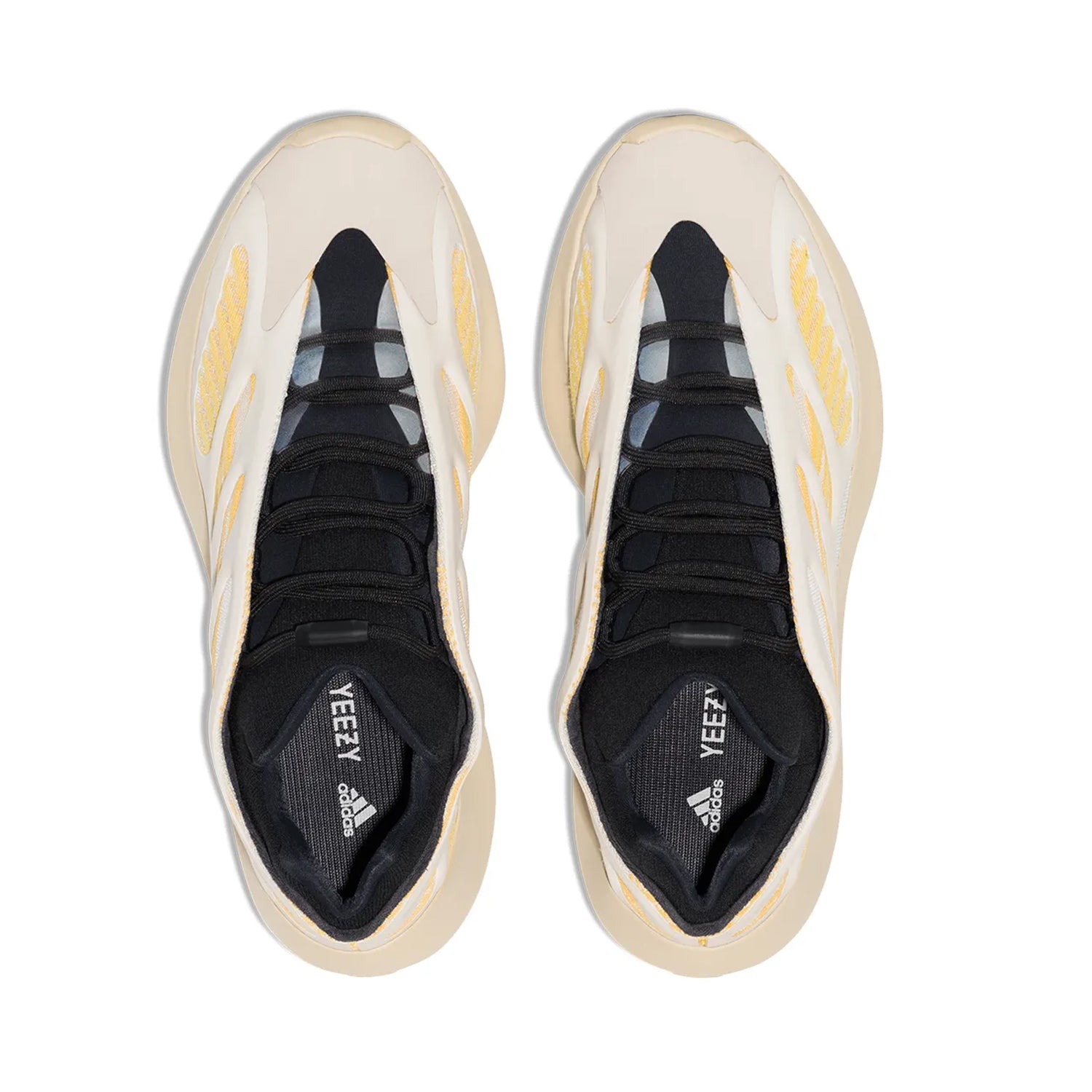 Yeezy 700 V3 Safflower reprezintă o evoluție a modelului original Safflower din 2018. Partea superioară este realizată dintr-un material mesh monofilament în nuanțe de crem și portocaliu, oferind un aspect futurist. Cage-ul semi-translucent RPU, care strălucește în întuneric, adaugă un element distinctiv și funcționalitate sporită. Construcția bootie asigură o potrivire confortabilă, iar talpa intermediară EVA oferă o amortizare ușoară și suport. Designul fără șireturi și combinația de culori neutre fac din acest model o alegere versatilă pentru diverse ținute casual și streetwear.